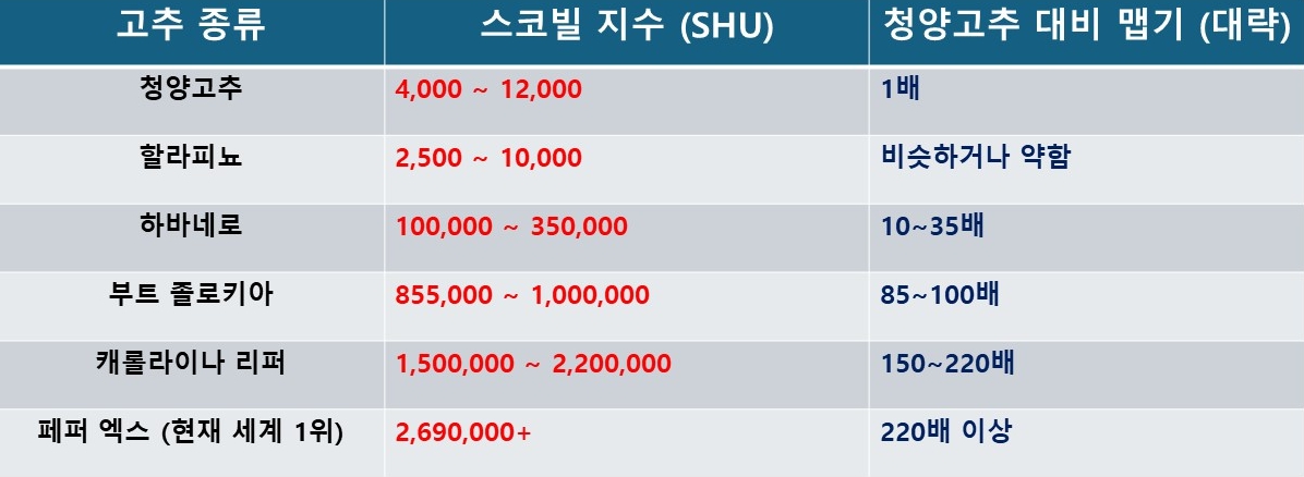 ※ 스코빌 지수: 청양고추는 일반적으로 4,000 SHU에서 12,000 SHU 사이의 값을 가집니다.