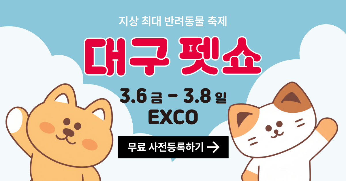 지상 최대 반려동물 축제 '대구펫쇼' 무료 사전등록 OPEN! 대구펫쇼가 3월 6일(금)부터 8일(일)까지 3일간 대구 EXCO 동관에서 펼쳐집니다 대구, 경북 집사님들은 꼭 한번 가야하는 '대구펫쇼' 댕냥이