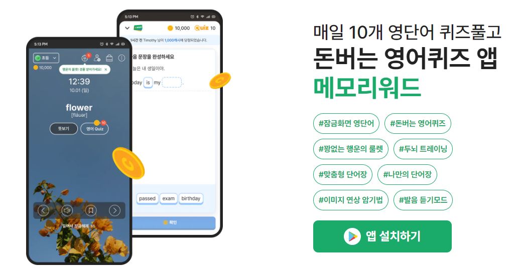 핸드폰을 켜는순간 시작되는 영단어 학습! 영어단어 퀴즈 맞추면 돈도 버는 단어장! 돈버는 영단어장 메모리워드에서 캐시 적립하며 영어 공부하세요