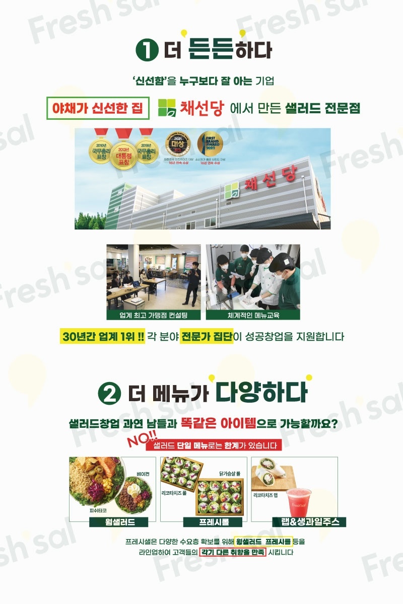 30년 프랜차이즈 장인 "야채가 신선한 집" 채선당이 만든 샐러드 전문점 "프레시샐" 입니다. ‘신선’이라면 가장 자신 있는 분야인 채선당이 수 년간의 개발 끝에 론칭한 샐러드 전문점 브랜드