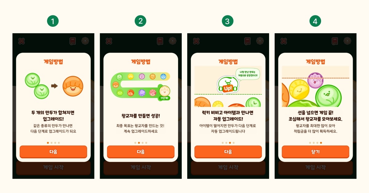4. 만두가 합쳐지지 않고 쌓이다 맨 위 점선을 넘으면 게임 끝!